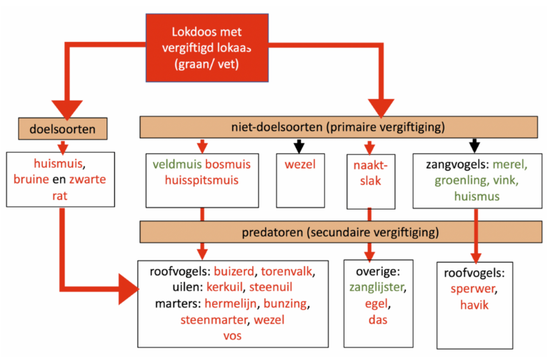 Hieronder een schema uit bovenstaand onderzoek over hoe het gif vanuit de lokdoos verspreidt wordt naar andere dieren.
